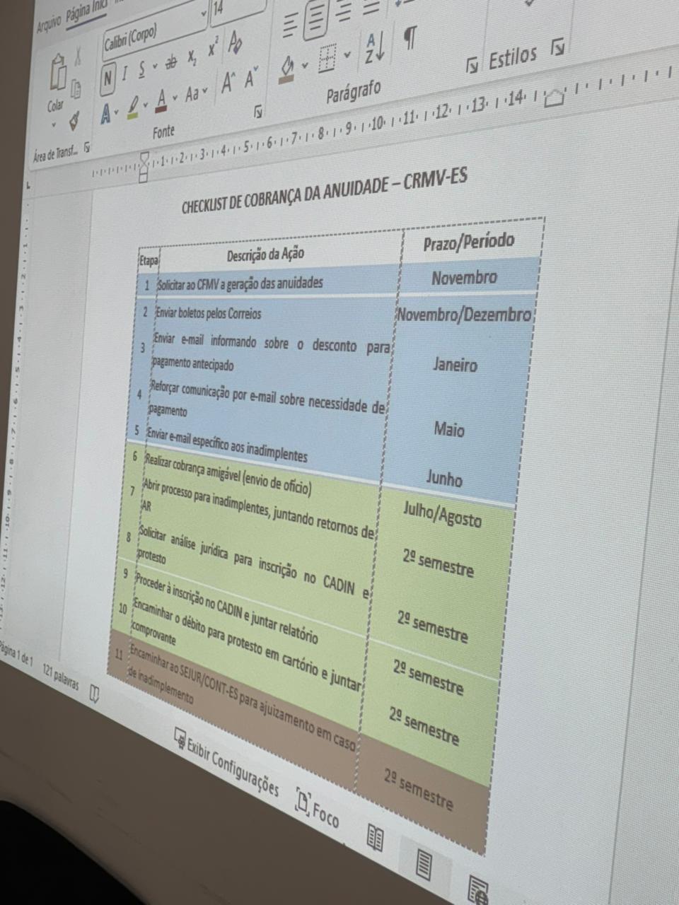 Durante os dois dias, foram abordados temas fundamentais para o aprimoramento da atuação institucional, como o histórico do Cadin, a utilização prática do sistema para consulta e gestão de inscritos, além da análise das ferramentas de cobrança administrativa disponíveis. A programação incluiu, ainda, a construção de um checklist destinado a padronizar os procedimentos relacionados à cobrança das anuidades (foto ao lado), fortalecendo a eficiência e a segurança jurídica das ações do Regional.